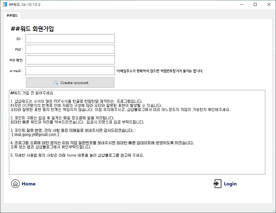 - 회원가입 절차는 간단합니다. 최소한의 개인정보 (비밀번호 찾기를 위한 이메일만)로 가입이 가능합니다.